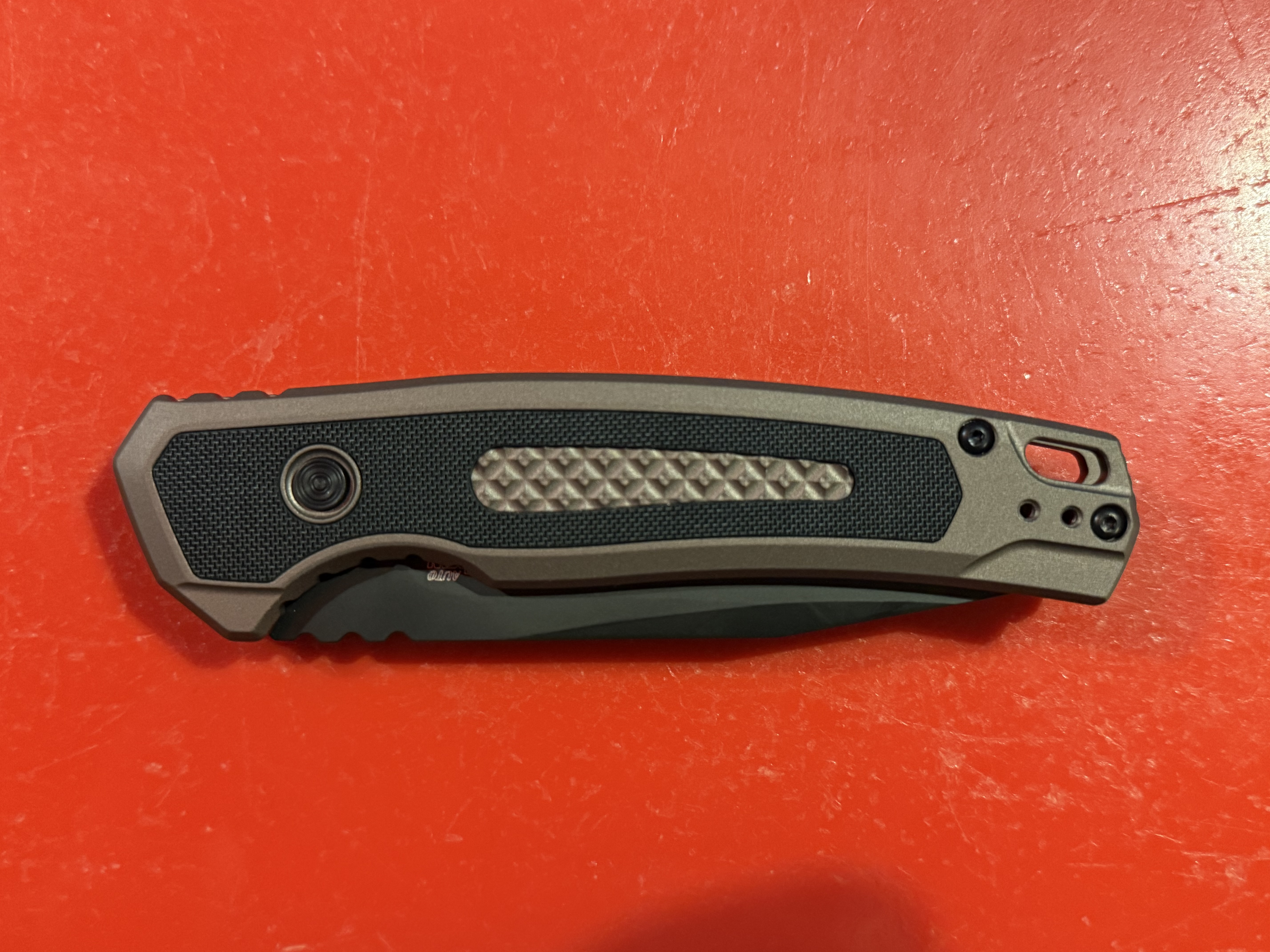 Клинок здесь — clip-point. Форма с выраженным прямым скосом и ярко выраженным остриём даёт прекрасный контроль при проколе и точных работах, делая нож практически универсальным. Сталь — премиальная CPM M4, инструментальный порошковый сплав, известный своей выдающейся твёрдостью и износостойкостью. Этот материал держит режущую кромку на уровне лучших суперсталей, но требует ухода из-за невысокой коррозионной стойкости — нож не стоит оставлять мокрым. Клинок имеет чёрное PVD покрытие, что защищает от царапин и ржавчины, а также делает внешний вид достаточно агрессивным. Автоматическое открытие происходит по нажатию на малозаметную кнопку — она утоплена в рукояти, что снижает риск случайного срабатывания. Механизм блокировки button lock, надёжный и проверенный временем формат, удерживающий клинок в рабочем положении с высокой степенью безопасности.